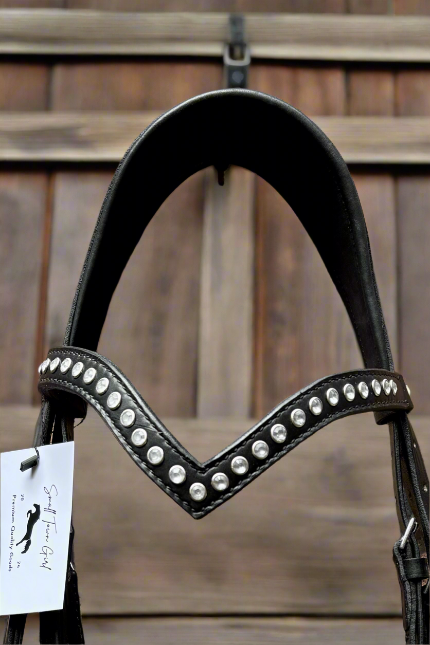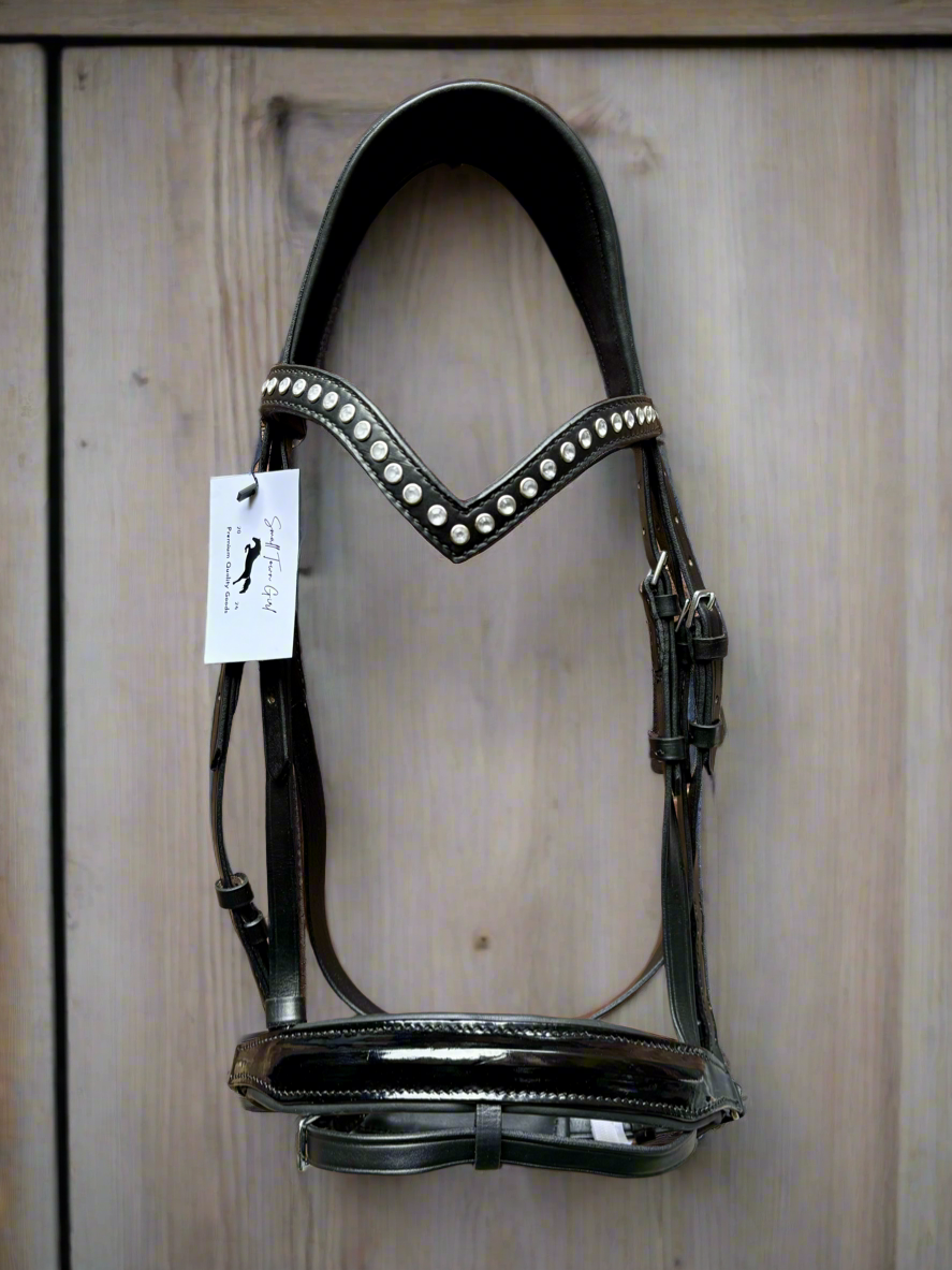 The bridle is handcrafted from soft leather. The headband is anatomically curved away from the ears and to ease pressure across the poll.