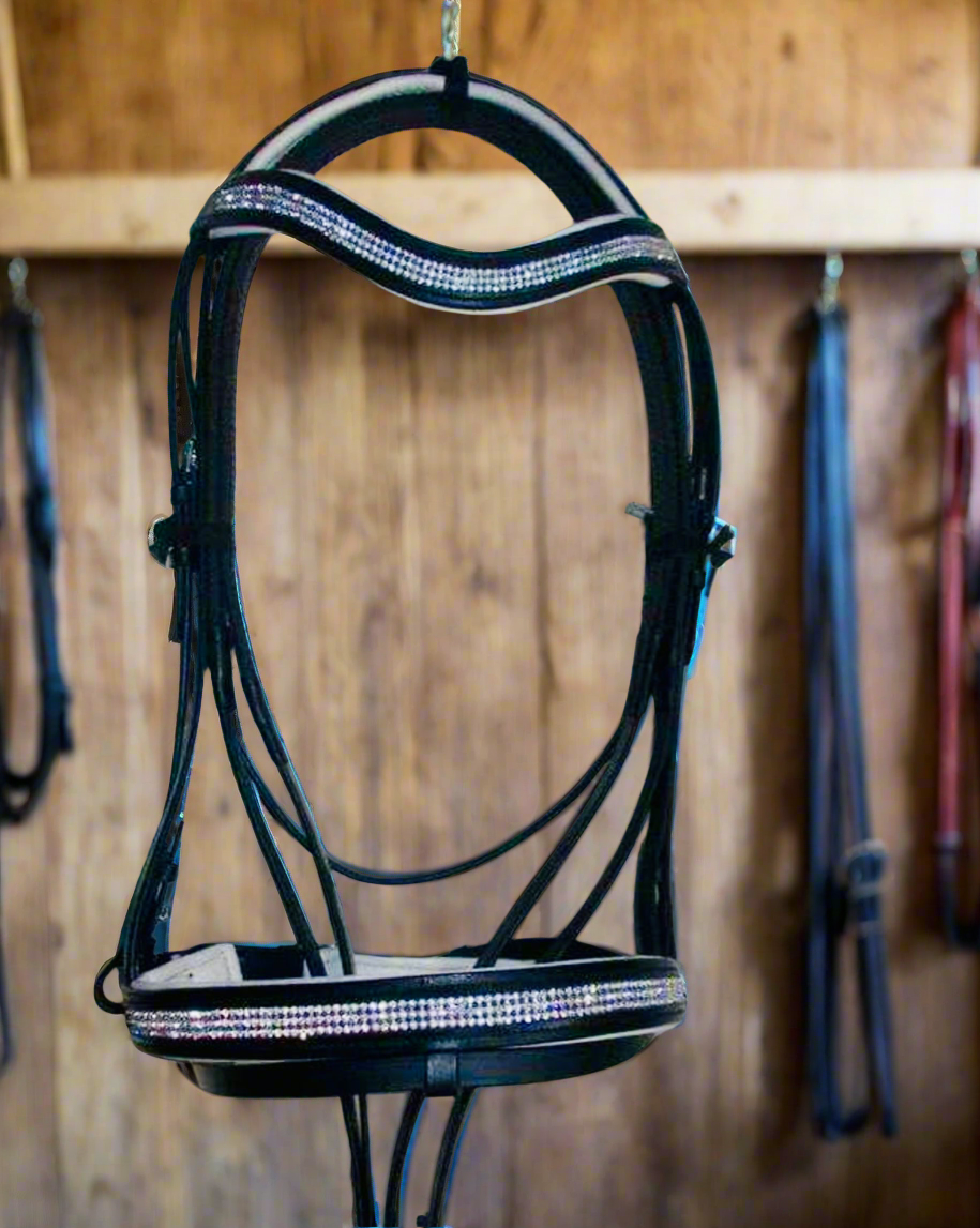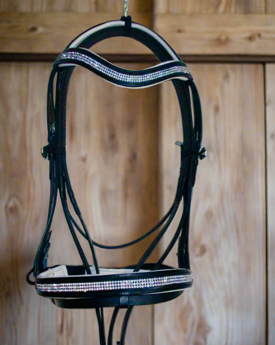 Experience elegance and royalty with our Princess bridle. This bridle features a stunning crystal noseband and browband, in black and white leather.
