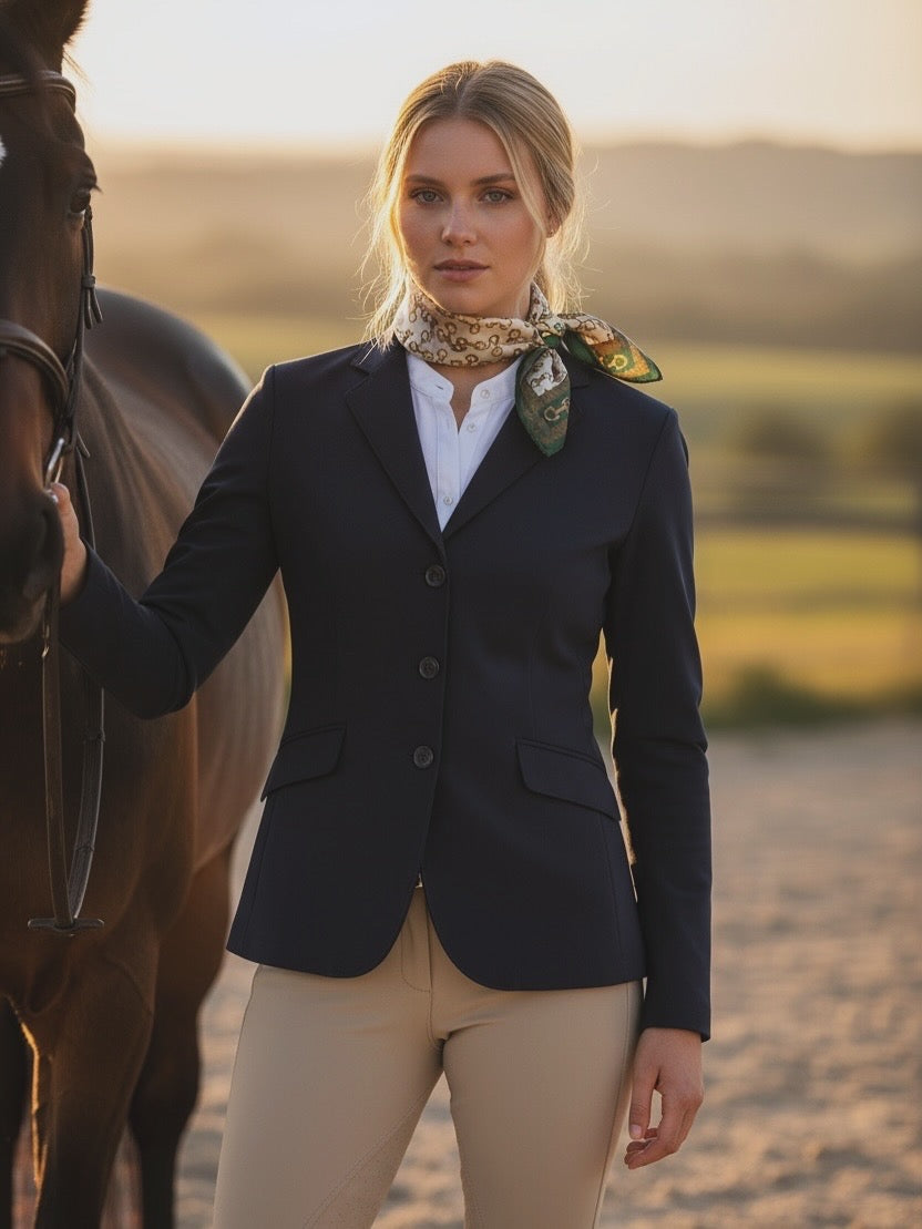 The Greenwich Polo Scarf — Green Edition brings a fresh take on equestrian elegance, featuring golden bit detailing framed by deep green and rich red borders. Finished with the Small Town Girl signature and horse emblem, it blends heritage style with a modern touch of sophistication.